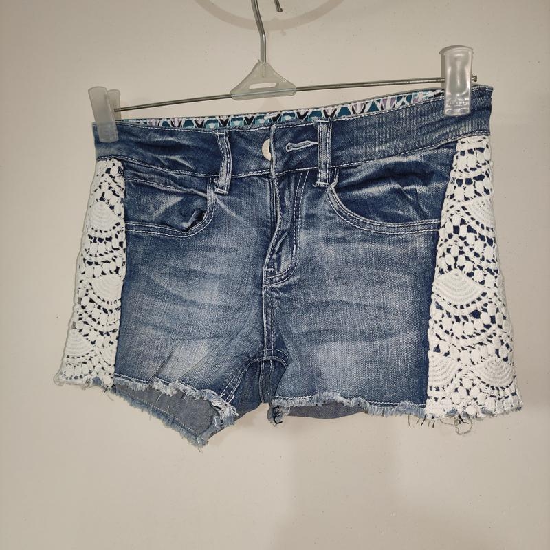 Короткі джинсові шорти з ажурними лампасами.