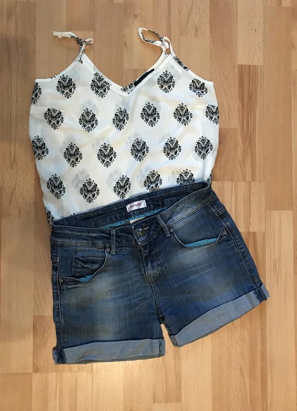 Жіночі джинсові шорти фірми Orsay Середня посадка, відмінно сидять по фігурі. Розмір 34, за фактом підійде на 36. Піт - 36 Побіди - 46 Посадка спереду - 21 Довжина виробу - 30 Тканина трохи тягнеться, колір тканини на 3 фото Без дефектів При замовленні подарунок - шифонова Майка розміру з-м