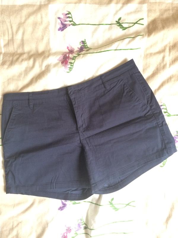 Котонові шорти темно-синього кольору, є кармані, петлі під пояс. Заміри(см): ПОТ-45, ПОБІДИ-53, Півобхват ноги-32 см, довжина 33 см