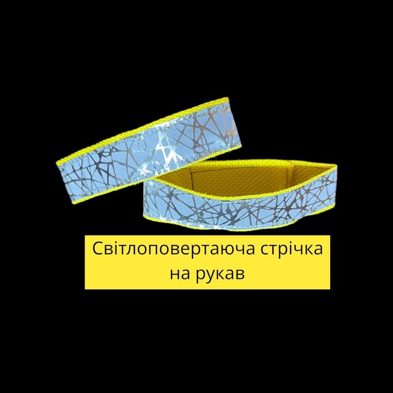Світлоповертаюча стрічка Павутинка на рукав. Кріпиться за допомогою липучки. Світловідбиваюча тканина нашита на ремінну стрічку, що робить аксесуар міцним. Добре тримається на рукаві. Можна причепити на сумку. Розмір 33*3 см або 40*3см. Колір жовтий