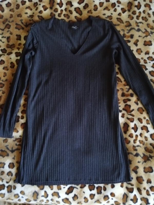 Кофта в рубчик. Чорного кольору. Рукава з розрізами. Також має два розрізи по бокам. Подовжена, довжина 84 см. Рукава 62 см, розріз на рукаві 12 см. Пог 49 см. Тягнеться. Чорного кольору.