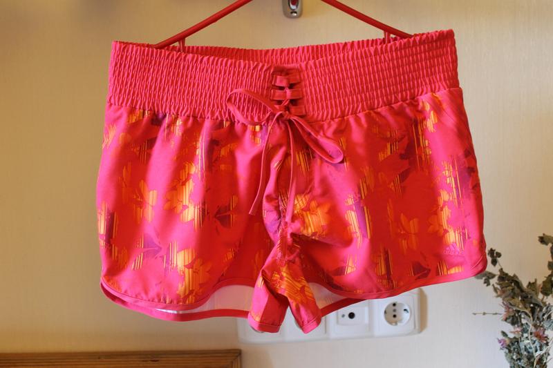 Дуже гарні яскраві шорти adidas. Ідеальний стан. Напівобхват пояса 40см( гумка не розтягнута, з затягнутими шнурками), регулюється до 43см. Побіди 56см, посадка ззаду з гумкою 31см, посадка спереду 27см, ширина гумки 6,5 див. Стан нових, без підкладки. Пояс на липучках.