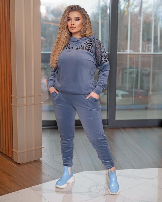 красивий спортивний костюм зі вставкою перфорацією, тканина - велюр, добре лягає по фігурі, виглядає костюм дуже ошатно і стильно, -брюки з кишеньками, в поясі широка гумка, внизу на манжетах, -кофточка з капюшоном, можна носити прямо, можна з напуском затягнувши внизу шнурівку, дуже прикрашає вставка з перфорацією на основі, рукави з манжетами, спинка прямий крій