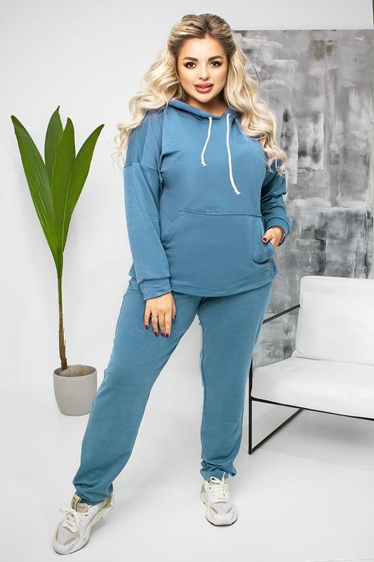 Склад: поліестер-45% бавовна-55% Сезонність: весна, осінь Розмірний ряд: 46, 48, 50, 52, 54, 56, 58, 60 Матеріал: 2х нитка Спортивний костюм, що складається зі худі і штанів, підкорює, на перший погляд, простотою. Худі з капюшоном і кишенею "кенгуру", без пояса. Рукави на манжетах. Штани з поясом на резинці, з бічними кишенями, звужені донизу
