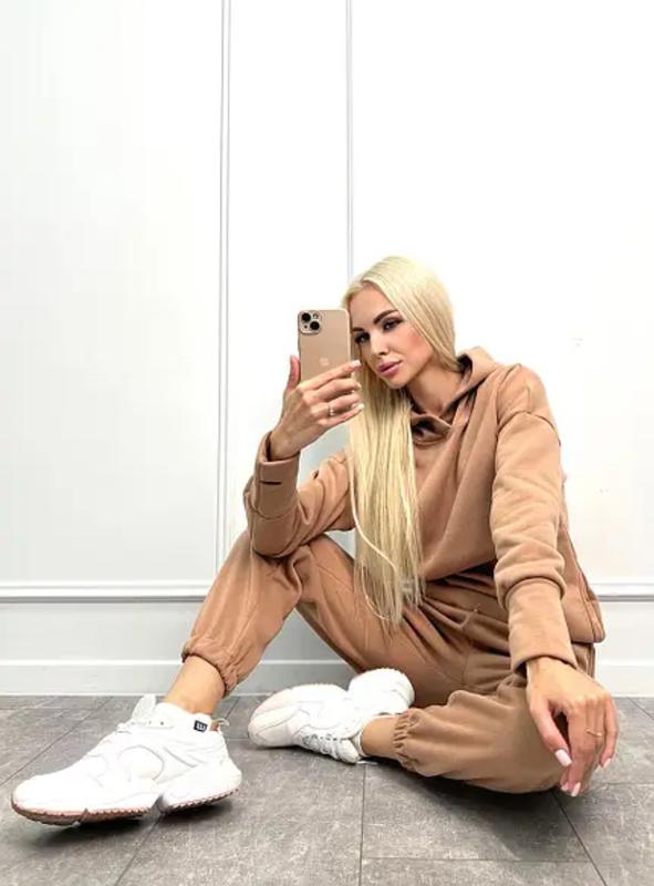 ✨ Теплий зимовий жіночий спортивний костюм на флісі Розміри: 42-44, 46-48,⠀ Кольори: чорний, малиновий, ліловий, пудра, капучино, чорний меланж. Матеріал: Тринитка на флісі Заміри: Довжина кофти по спинці:68-69 см, Довжина рукава від горловини: 71-73 см Довжина бічного шва: 101-103 см, Довжина крокового шва: 73-75 см Ціна 🏷: 749 грн Новий спортивний костюм складається зі худі та штанів вільного крою. Ця модель не схожа на інші та має стильний дизайн із родзинкою. Рукави кофти-худі мають не прості манжети — це мітенки, які додатково захищають кисті рук від холоду. Також нетиповим є розміщення кишень на кофті — вони заховані в бічні шви виробу, що робить їх ще практичнішими. Штани також із кишенями, мають зручну середню посадку. Пояс і штанини виробу на гумці. Поясок додатково фіксується шнурком. Виготовлений теплий костюм із тринитки — це щільний трикотаж на флісі. Матеріал приємний до тіла, не кусається й не створює інших дискомфортних відчуттів. Костюм із цього трикотажу не буде вибагливий у догляді: рекомендуємо прати за температури 30 градусів і в делікатному режимі. 💙 Записуйтеся на мою сторінку💛 💛 Щодня на Вас чекають новинки 💙 💙 одягу, взуття та аксесуарів💛