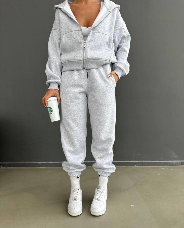 Знову у наявності🙌 Наші костюми🔜модні та сучасні, стильні та тепленькі🔥 Кольори🎊 - Чорний - Графіт (Темно-сірий) - Білий меланж (Світло-сірий) - Темно-зелений - Беж ➡️Мод. pa 4059 ➡️Тканина: Трьохнитка на флісі (дуже якісна тканина, не кошлатиться) Розмір: 42-44; 46-48 Довжина штанів: 99см 100см Обхват груди: 97си 110см Обхват стегна: 95см 107см Довжина кофти 57 см