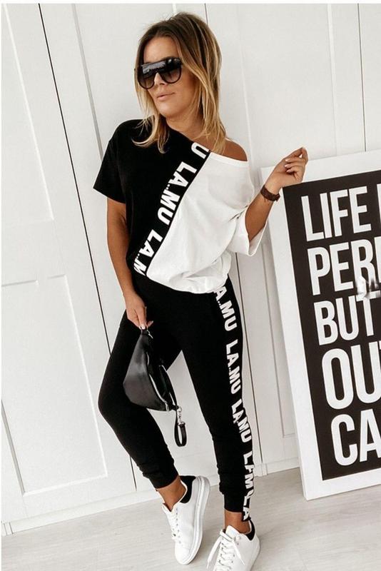 Мод:7162 Костюм Тканина: двонитка турція (НЕ КОШЛАТИТИСЯ), якісний накат Розміри: 42-44, 46-48, 50-52 Колір: чорно-білий Якість супер! Заміри 42-44 Футболка Ог-48см Дл по спинці — 56 см Штани Від 34 см (гумка) Об-50см Довга за зовнішнім швом-93см 46-48 Футболка Ог-53см Дл по спинці-53 Штани Від-37 см Об-53 Дл-98 50-52 Футболка Ог-60см Дл-62 см Штани От-40см Об-58см Дл-101см