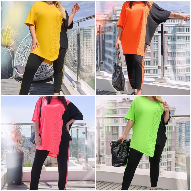 Мод#285 (ал-коз) Костюм "Неоновий асиметричний" Розміри: 48-50, 52-54, 56-58. Розміри йдуть спарені. Тканина: Двонитка + стрази якості DMS. Додаткові характеристики: Стильний, красивий, яскравий, прогулянковий костюм. Кофточка асиметричного вільного крою, спереду декорована стразами. Штани теж з асиметрією напівобтислі, з лампасами, декоровані стразами. Посадка висока, зручний шов сидіння, пояс на гумці — прострочений на спеціальному обладнанні для гарної фіксації гумки — не обертатиметься. З кишенями. Колір виробу: Кофточка: Салатовий. Жовтогарячий. Жовтий. Рожевий. Штани чорні. Фактичні вимірювання: За 52-54 розміром. Кофточка: Довжина — 80/70 см. Рукави від горловини — 43 см. ОГ – 142 см. На подолі — 128 см. Штани: Довжина зовнішнього шва — 98 см. Довжина внутрішнього шва — 72 см. Обсяг стегон — 120 см. До кожного подальшого розміру додавання + 4 см (на поодинокі розміри). На спарені +8 см, крім довжини виробу. Зріст моделі на фото: БЛОНДИНКА 171 см. ШТАНИ 174 см. На моделі одягнений: 52-54 розмір. Параметры модели на момент съемки: БЛОНДІНКА: ОГ — 15 см. ОТ — 85 см. ОС — 120 см. БРЮНЕТКА: ОГ-112 ОТ — 82 ОС — 116