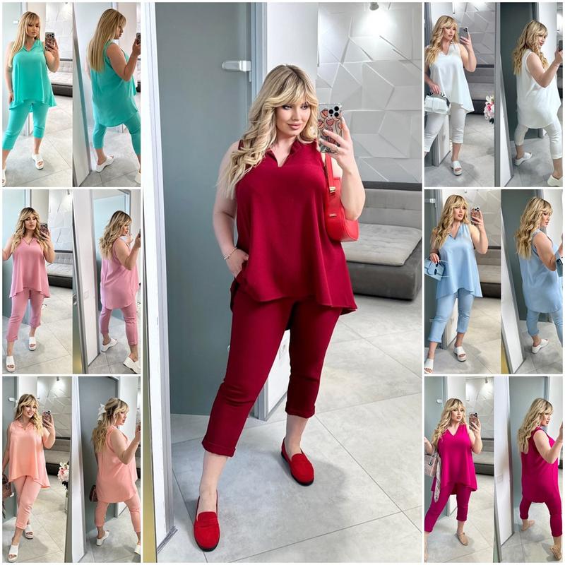 Код 3750 Костюм Тканина: літній креп. Кольори: малина, пудра, блакитний, молоко, бордо, мигт, персик. Розміри: 48-50; 52-54; 56-58; 60-62. Довжина туніки: 73/91, 75/93, 77/95, 79/97 см. Довжина штанів по зовнішньому шву: 88, 89, 90, 91 см. Довжина штанів по внутрішньому шву: 60, 60, 60, 60 см Заміри виробу: туніка 48-50 ОГ 110 ОТ 124 Об 152 52-54 ОГ 118 ОТ 132 об 160 56-58 ОГ 126 ОТ 140 об 168 60-62 ОГ 134 ОТ 148 Об 176 Штани 48-50 ОТ 68/106 Об 106 52-54 ОТ 76/114 Об 114 56-58 ОТ 84/122 Об 122 60-62 ОТ 92/130 Об 130 На моделі розмір 52-54 Зріст 171 см. ОГ 110 ОТ 80 об 116 см. Стильний повсякденний костюм із легкого кропу: туніка + штани кюлоти (розтяжність кропу мінімальна). Туніка без рукавів, виріз горловини V-подібний, низ асиметричний; попереду коротший, по спинці довший. Застібок немає. Штани прямі, укорочені, внизу із закотом. На талії зібрані на гумку, у бічних швах оброблені кишені.