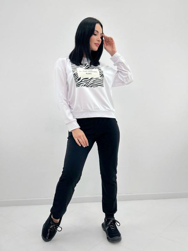Головна особливість нової моделі – стильний анімалістичний принт, який знову в тренді. Світшот має круглу горловину, спущену лінію плеча та вільний крій, що забезпечує комфорт у русі. Штани, доповнені зручними манжетами, не тільки ідеально сидять на фігурі, але підкреслюють динамічність образу. Костюм пошит з двонитки, довговічної та дуже приємної на дотик. Кольори: білий+графіт, білий+чорний, чорний+чорний Матеріал: трикотаж двонитка Розміри: 42-44, 46-48, Виміри норма: Довжина кофти по спинці: 60-61 см Довжина рукава від горловини: 67-68 см Довжина бічного шва штанів: 95-96 см Довжина крокового шва: 73 см Відправка тільки новою поштою і укрпоштою!!! код 7959