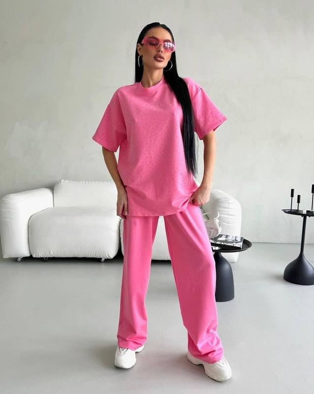 Костюм 🩵Мод.021 🩵Розміри: 42-46, 48-52 🩵Тканина: віскоза 🩵Кольори: чорний, білий, графіт, малина 🩵Ціна: 1100 грн.🏷️ Футболка принтована блискучім камінням, якість 🔝🔝🔝 📌Заміри: 42-46 Футболка Полуобхват грудей - 58 см. Довжина рукава - 31 см. Довжина - 75 см. Штаны От - 70 Ос - 94-98 Довжина - 105 см. 48-52 Футболка Полуобхват грудей - 65 см. Довжина рукава - 31 см. Довжина - 76 см. Штани От - 80 см. Ос - 100-105 см. Довжина - 105 см.