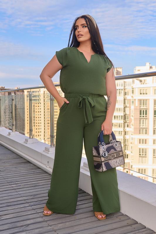 Літній повсякденний костюм зі жатки: стиль і комфорт для теплих днів Такий літній костюм -- ідеальне поєднання модних тенденцій та комфорту. Включаючи легку блузу-майку і широкі штани , модель створить стильний і невимушений образ для спекотних літніх днів. Простий, але елегантний дизайн, свобода рухів та високоякісний матеріал роблять цей комплект незамінним елементом літнього гардеробу. Основні особливості моделі: 1. Трендовий вільний крій Костюм виконаний у сучасному стилі з вільним кроєм , що відповідає останнім модним тенденціям. Він ідеально підходить для тих, хто шукає баланс між елегантністю та зручністю. Костюм легко носити у будь-якій ситуації, від прогулянок містом до більш офіційних зустрічей. 2. Максимальний комфорт Завдяки середній посадці та тканинному поясу штани підкреслюють фігуру, сидять зручно, не сковуючи рухів. Простора блуза та штани створюють розслаблений, але стильний образ, що ідеально підходить для повсякденного носіння. 3. Легкість у поєднаннях Відтінки костюма, такі як джинсовий , бежева та блакитна гама легко комбінуються з різними аксесуарами. Будь то ділова зустріч або вечірня прогулянка, костюм стане чудовою основою для створення стильного та гармонійного образу. 4. Якісний матеріал Костюм виготовлений з американського креп-жатка , матеріалу, який відрізняється легкістю, міцністю та приємною текстурою. Він добре пропускає повітря, не сковує рухів і зберігає форму навіть після прання. Особливості: - Стиль : Casual - Сезон : Літо. - Довжина блузи : 58-59 см - Довжина крокового шва : 70 см - Довжина бокового шва : 100 см - Матеріал : Американський креп-жатка Доступні кольори та розміри: - Кольори : - Джинси (42-44) - Бежевий (42-44, 46-48, 50-52) - Блакитний (42-44, 46-48, 50-52) - Хакі (42-44, 46-48, 50-52) Цей костюм - ідеальний вибір для вашого літнього гардеробу! Легкий, стильний та зручний костюм з вільним кроєм подарує вам максимальний комфорт у спекотні дні та легко комбінується з іншими речами. Вибирайте модні відтінки та насолоджуйтесь кожним моментом у цьому універсальному та практичному вбранні!