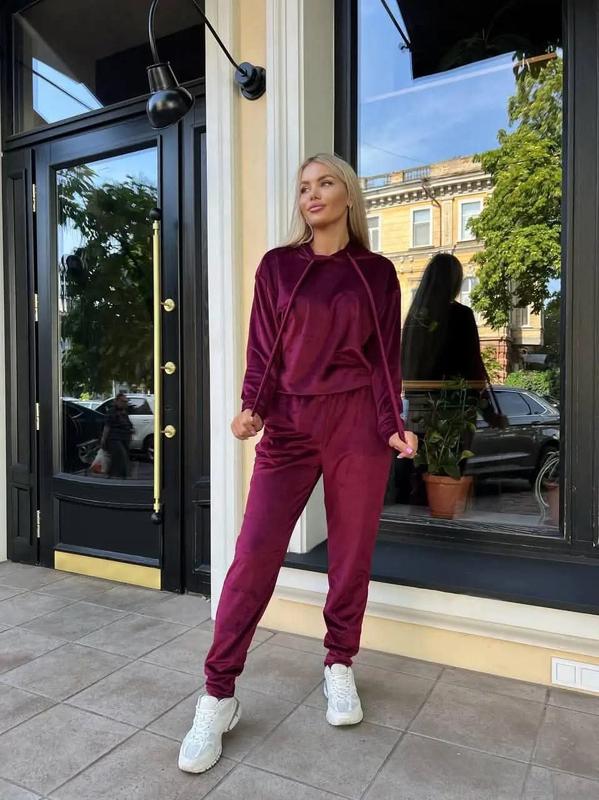 Жіночий велюровий спортивний костюм з капюшоном бордо Розмір: 44-48( півобхват грудей 57см, рукав від шиї 70см, довжина 66см; півобхват талії 34-50см, бедра 55см, довжина 98см)