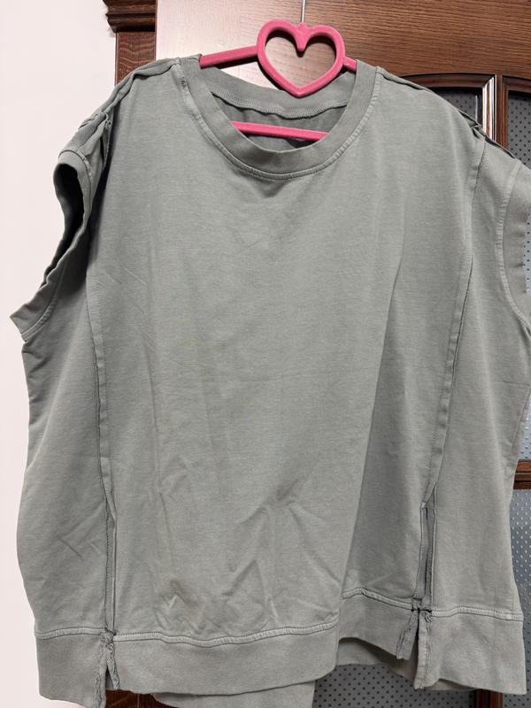 Костюм в сіро - оливковому кольорі. Футболка на ог-68, довжина-68см. Довжина штанів 95см на поясі резинка. Купила для себе, новий але відрізала етикетку, ( непідійшов колір).