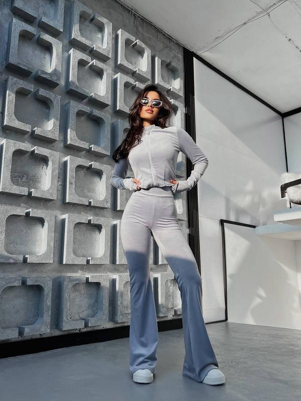 Сірий велюровий спортивний костюм кофта корсетного крою з прорізами для пальчиків на рукав...