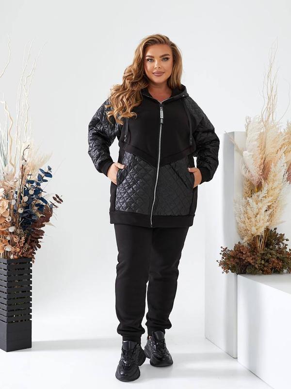 Костюм двійка 2 Колір: чорний, графіт, пляшка 3 Тканина: тринитка на флісі + плащівка стьобана на синтипон 60, з вивороту плащівка ,така що і з обличчя 4 Код: 1388 5 Розміри: 52-54,56-58 60-62,64-66 68-70 6 Виміри: довжина кофти 81 см, рукав від горловини 76 см, штани з бокового 112 см 52-54: кофта вог = об=124, про штани 116 см 56-58: ог і об 132, про штани 124 см 60-62: ог і об 140, про штани 132 см 64-66: ог і об 148, про штани 140 см 68-70: 156 см, штани 148 Тринитка тягнеться, тому до заміру про штани можна +8 см сміливо 📌📌📌