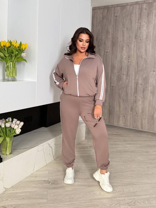 Костюм Мод 132 Костюм двійка- дуже комфортний та легкий ! Сезон - весна Кофта на блискавці ,є кишені! Вздовж рукава подвійна стрічка в кольорі айворі! Штани на глибокій посадці , в талій резинка! Низ штанів на резинці ! Розміри:50-52,54-56,58-60 Кольори:чорний, графіт , ніжний моко Тканина:двонитка (тонка і гарної якості) Виміри костюма: ОГ - 128,138,142 см ОТ-78,84,94 см( резинка) ОС - 126,132,140 см Довжина кофти по спині:65 см Длина рукава:52,53,54 см Довжина брюк: 105/76,107/78,110/77 см На моделі розмір:50-52