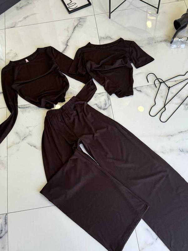 📣УВАГА📣СПЕЦІАЛЬНА ПРОПОЗИЦІЯ🔝 🔥АКЦІЙНА ЦІНА 980 грн на наші BESTSELLERS 3в1😍 ФОТО РЕАЛ 🔸Костюм трійка (футболка+лонг+палаццо) ▪️Модель: 1628 ▪️Тканина: натуральна віскоза (Туреччина) ▪️Розмір: 42-46 (onesize) ▪️Колір: синій, меланж, графіт, чорний, шоколад Супер якість за низькою ціною🔥 💬Стильна базова трійка з палаццо для весняних та літніх прогулянок: ідеальний крій, базові кольори та натуральна «дихаюча» тканина. Футболка скімс, штани палаццо вільного крою та лонгслів з вирізами для пальчиків🔝 Параметри: Футболка: довжина 50 см; ОГ 85-94 см Лонгслів: довжина 50 см; ОГ 85-94 см Штани: довжина 110 см; ОС 88-106 см; ОТ 64-78 см