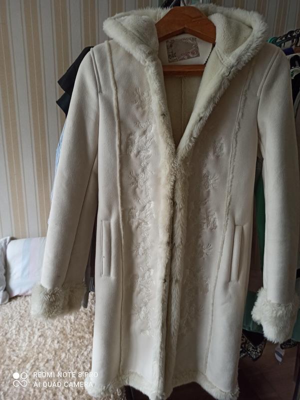 Дублянка біла, зі штучним хутром, з білою вишивкою