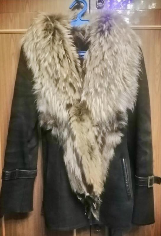 Чорна дублянка з натуральної шкіри та хутра, з поясом, дуже тепла. Довжина посередині стегна