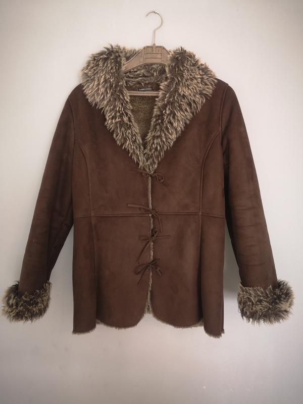 Дублянка коричневого кольору на зав'язки. Без плям та дирок. Легенька та тепла. Довжина виробу - 71см Ширина під пахвами - 54 см Довжина рукава - 60 см