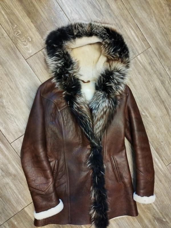 Бомбезна стильна дублянка з натуральної шкіри з капюшоном. Дуже тепла та красива. Можна носити з поясом i без. Привезла для себе із Туреччини. Класична M. Довжина рукава від плечового шва 65 Довжина виробу від плечового шва 81.