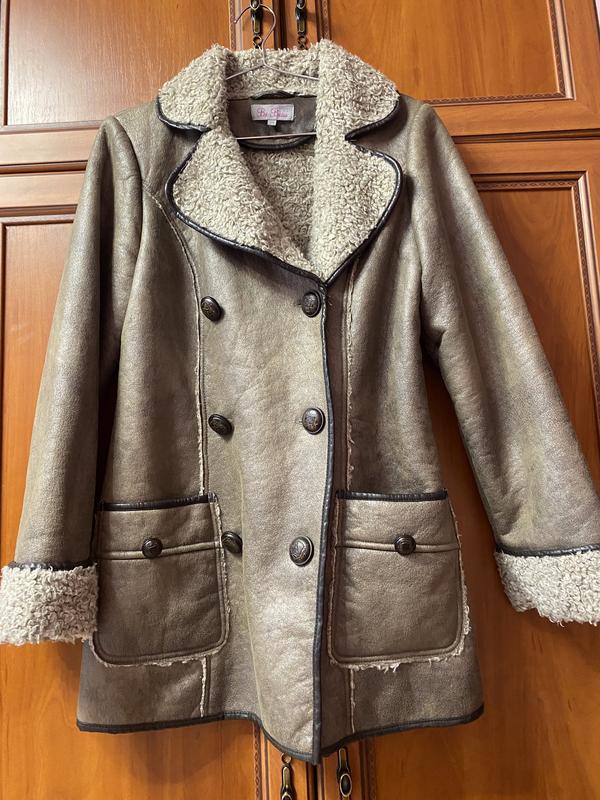 Жіноча дублянка, розмір 12, колір сіро-коричнева, фірма BE BEAU. Штучна, на гудзиках, має пасок, 2 накладні кишені, рукава регулюються. Легка, зручна, практична! Є торг!