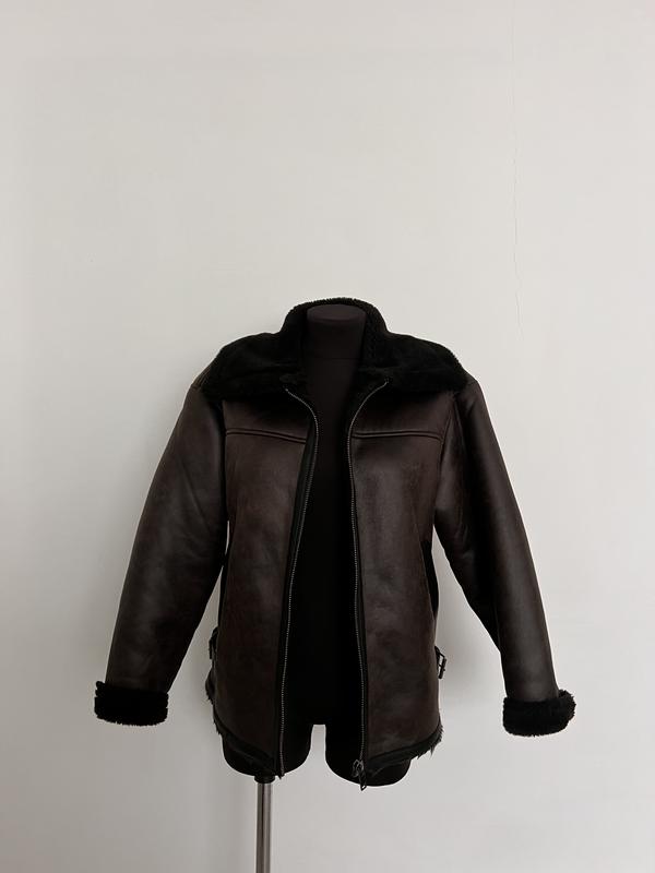 Нова двостороння куртка зі штучної шкіри з ношеним ефектом, коміром зі штучного хутра, застібкою на блискавку та бічними кишенями. Розмір М. Вдягалась один раз