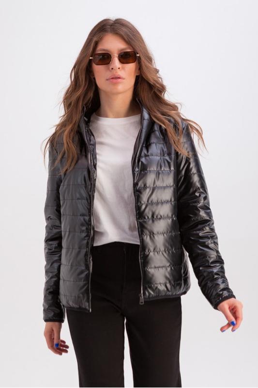 Куртка жіноча коротка демісезонна, з капюшоном, демі, металік, на блискавці, і чорна 44