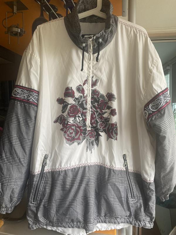 Цікава куртка, рідкий екземпляр , утеплена. Фасон вільний, знизу на кулісці. Стан для такої речі непоганий. Фурнітура у відмінному стані. Ззаду є маленька зачіпка та ледь видна пляма, на фото видно. На розмір С та М як оверсайз або Л -ХЛ. Пог 65, плечі спущені 60, рукав від горловини 76, по низу 60, довжина 76.