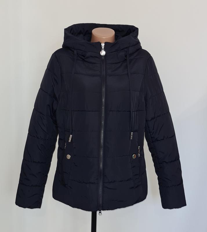 Демісезонна коротка куртка з капюшоном темно-синього кольору. Є 2 кишені на блискавках й одна внутрішня кишенька. Розмір 48: (обхват по грудях 108 см, обхват талії 102 см, обхват по низу 116 см, плече 9 см, довжина рукава 64 см, довжина куртки по спині від капюшона 61 см). Є така в чорному кольорі.