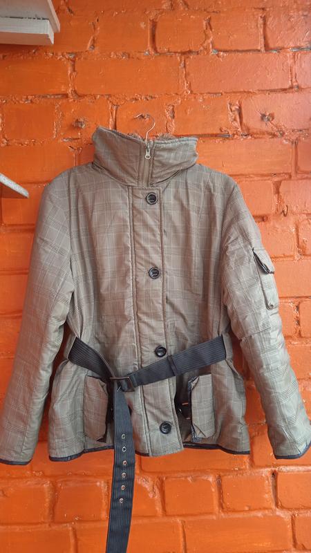 Гарний стан,принт клітинки,,має пояс,комір високий, іде в комплекті начіпний комірець з штучного хутра,має карманчики,пояс по талії,підбивку з середини, застібка змійка,і гудзички,наповнення та тканина поліестер довжина 65 рукав 61 пів обх гр 54 плечі 46