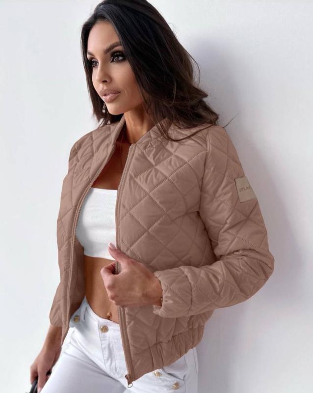 Куртка бомбер арт. gr. 8341 Розмір: 42-44, 46-48, 50-52 Колір: пудра, білий, беж, мокко, чорний Тканина: плащівка прошита з синтепоном 100 + якісна підкладка Курточка бомбер на змійці, ніжні кольори весни, має кишені, резинка на манжетах і по низу курточки, має нашивку на лівому рукаві. Дуже гарно сідає по фігурі.