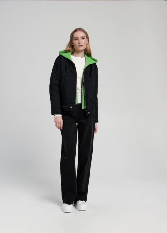 Розмір м , можна застібати зелену частину і виглядатиме ніби ви у ковті, а також можна відстебнути і буде просто класична чорна куртка) дуже стильна і оригінальна