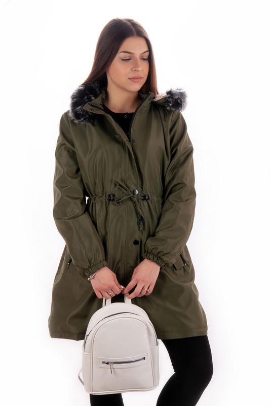 Парка, легенька, тепла. Цвет оливковый, воротник отстегивается, низ и талия регулируется кулиской.
