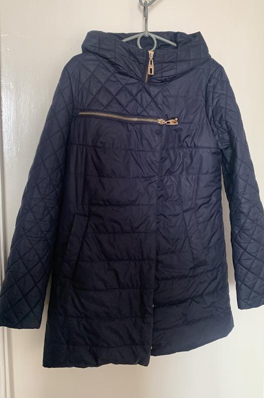 Осіння куртка Темно-синього кольору Розмір L Матеріал поліестер В гарному стані без дефектів Довжина куртки 78 см Ширина під руками 52 см Довжина рукава від плеча 63 см Застібка на замок та кнопки Капюшон не знімається