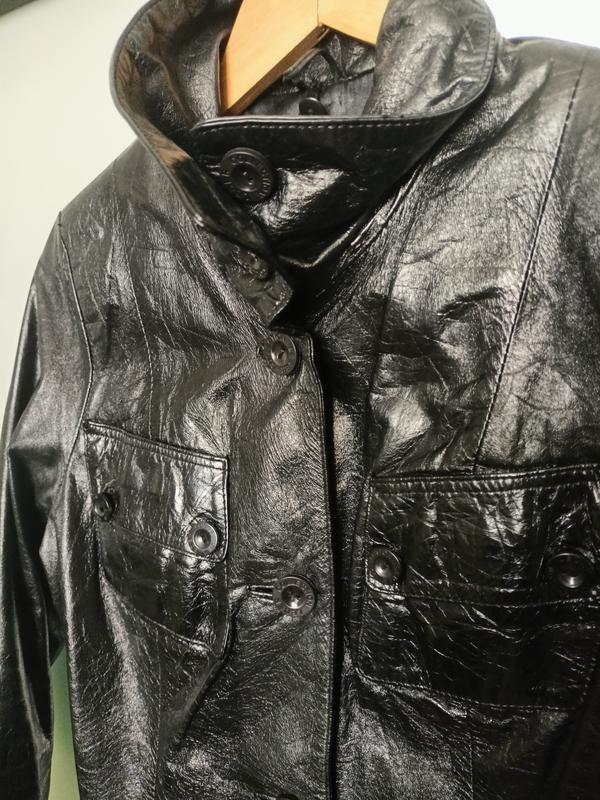 Шкіряна жіноча куртка, розмір по бірцв м,підійде на s, Довжина 63 см півобхват в грудях 43 Рукав від шиї 70,можна відкрити рукав і збільшити до 74-75см Талія півобхват 38 см має тоненький підклад