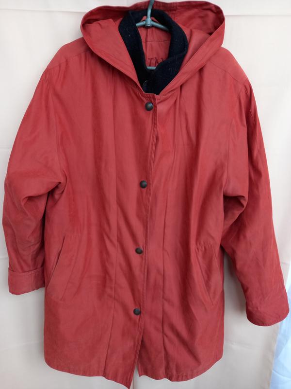 Отличного качества,кирпичного цвета.Плечи 50 см,ог 61 см,бёдра 66 см,рукав 63 см,длина 92 см