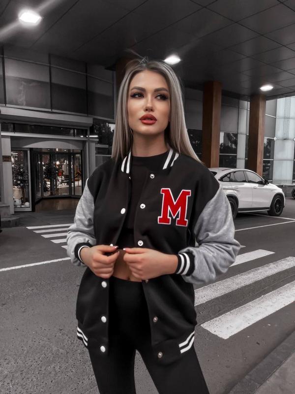 Бомбер жіночий літера «М» застібається на кнопках Горло, рукав та низ оброблені манжетою резинкою тканина: петля, тканева нашивка літера М. Арт: 10368 ● 790 грн. Розміри: с-м; л-хл Розмір с-м (42-46) Об. Гр. 108 см Довж. 71 см Довж. рукава -71 см Розмір л-хл (48-52) Об. Гр. 120 см Довж. 72 см Довж. рукава 72 см аппр5