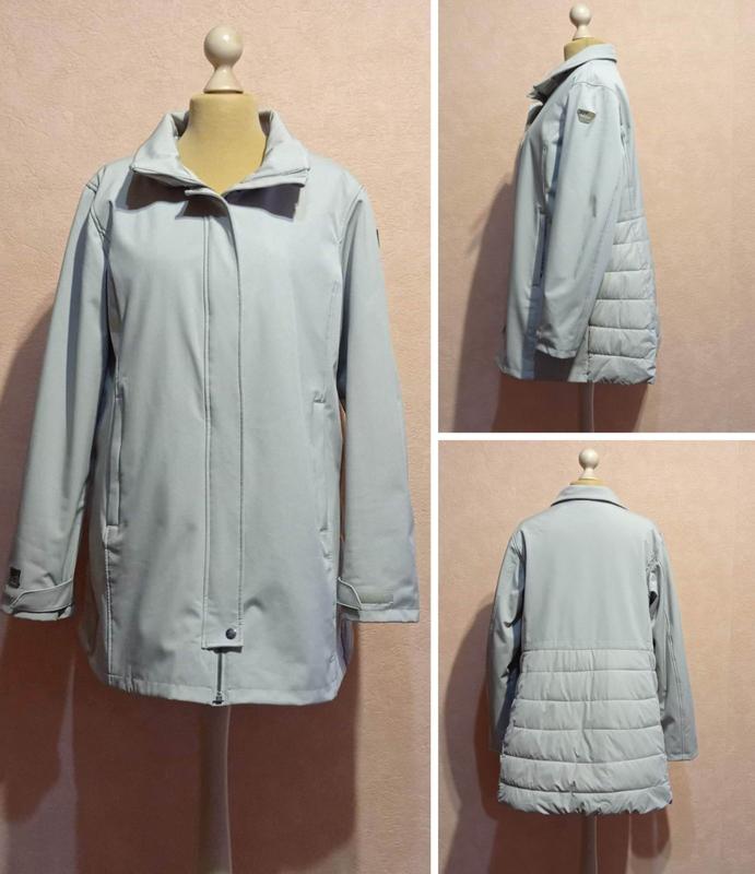 Жіноча подовжена демісезонна куртка, бренд ЕР (Фінляндія). Гарної якості фірмова жіноча куртка базового кольору з водовідштовхувальної тканини. Цікаве пошиття куртки. Спереду спортивний стиль, ззаду жіночна подовжена стьобана частина з іншої тканини тонша, яка не потовщує фігуру. Всередині куртки протягнута куліска, якою можна регулювати талію. Застібається на замок і кнопки. Продається без капюшона. Розмір 54-56. Довжина 76-84 см. Довжина рукава 66 см. Напівобхват грудей 62 см. Напівобхват талії 60 см. Напівобхват стегон 66 см. Ширина плечей 46 см.