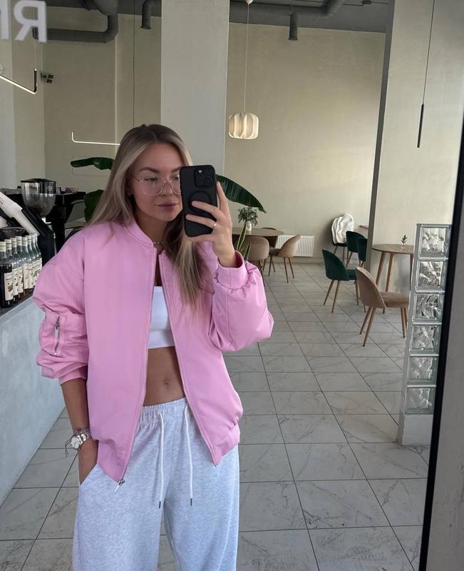 Бомбер🚀 ▪Тканина: плащовка+стьобана підкладка з синтепоном 100+ребана ▪Кольори: рожевий, графіт, молочний, чорний ▪Розмір:S-М; М-L Параметри на S-M: Довжина виробу 70 см Довжина рукава 80см ОГ 126 ОТ 116 📌Стильна новинка🔥Бомбер- найнеобхідніша річ у вашому весняному гардеробі. Обʼємний як на фото, якісна тканина та фурнітура, на рукаві також блискавка. Горловина, манжети та пояс з ребани в колір💣🔝Підкладка простьобана з синтепоном 100🔥