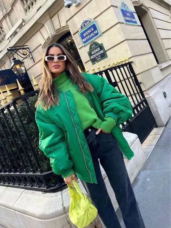 Розмірний ряд: XS-L, UA: 40-46, EU: 34-40. Опис моделі: трендовий бомбер зі збіркою на рукавах — це стильний і сучасний варіант жіночого верхнього одягу, який стане родзинкою жіночого гардероба. Цей бомбер має об'ємний крій. Збірка на рукавах створює цікавий акцент в образі. Зовнішній матеріал: поліестер. Застібка: на блискавці, кишені на кнопках.