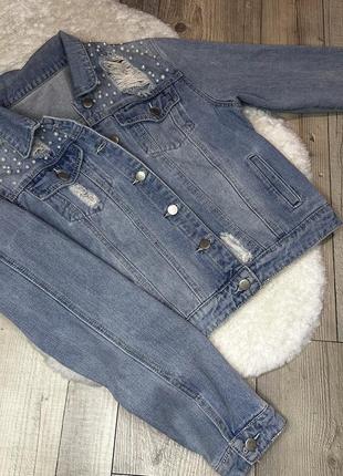 Джинсовка синього кольору з потертостями та бусинами Підійде на s-m Довжина: 50см Ширина по грудях: 45