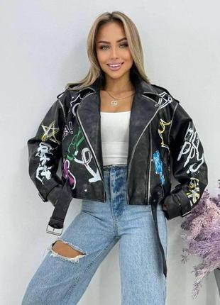 ⬆️НОВИНКА Стильна вкорочена косуха із еко-шкіри з кольоровими написами. Модель:2468 ❤️24 Розміри: S, M, L Кольори:чорний+срібло, коричневий+золото Матеріал:еко-шкіра Фабричний Китай Заміри: 💛Обхват грудей S-110см, М-112см, L-114см 💛Довжина 52см 💛Рукав S-74см, М-76см, L-78см