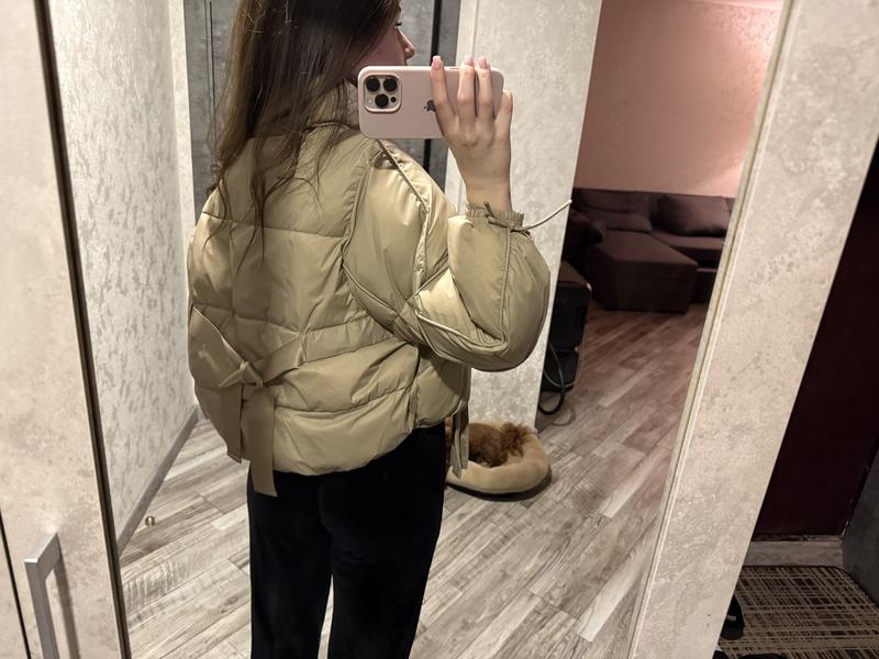 Вкорочена куртка бежевого кольору Плащова тканина, теплий наповнювач Склад 100% нейлон Розмір С: Довжина виробу 50-51см Довжина рукава 59-60см Обхват грудей 80-94см