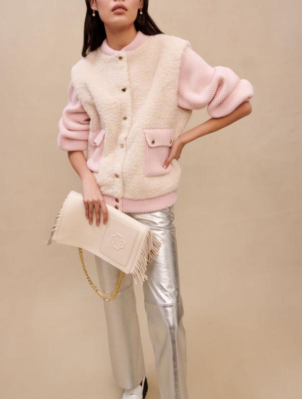 MAJE MFPBL00593_Pink-Ecru Ця куртка з поєднання штучного хутра та в'язаного матеріалу гарантує комфорт та стиль. Рожева ребриста в'язка та деталі Maje Clover додають їй чудового жіночного вигляду. Застібається на кнопки. Основний матеріал: 100% поліестер Підкладка: 100% поліестер Рукави: 56% акрил, 25% вовна, 19% поліамід Комір: 67% акрил, 28% вовна, 5% поліамід 7600036229258