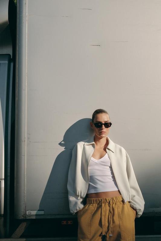 Куртка-бомбер із сорочковим коміром і довгими рукавами. Імітація кишень з подвійною обшивкою спереду. Об'ємні та еластичні деталі оздоблення. Застібка на блискавку спереду. СІРОВАТО-БЕЖЕВИЙ КОЛІР | 8372/246/712