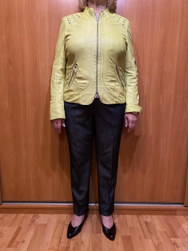 Жіноча шкіряна куртка салатового, або лимонного кольору німецького бренду. CRISCA — це німецький бренд жіночого дизайнерського одягу, який був заснований люксовою компанією Escada. Бренд був відомий своєю модною, але помірною за ціною повсякденною та діловою колекціями, а також аксесуарами. Одяг CRISCA позиціонувався як вишуканий і сучасний. На жаль, бренд припинив існування. Куртка виконана із мʼякої шкіри, має безліч деталей.. Плечі прикрашені металевими закльопками сріблястого кольору, молніі на кишенях виділені декоративною строчкою. На одному рукаві схожі декоративні молніі. Обидва рукава мають внизу молніі, які можна відкрити і підгорнути рукав, на одному фото я показала. Дуже мʼяка і комфортна куртка на демисезон. Розмір вказано 16. Я приміряю на 18(44)165 см і мені досить щільно, рекомендую на менший розмір. Раджу замовити безпечну оплату , щоб приміряти. Заміри: НОГрудей 57 см ( я приміряю на ог 115 і мені туго, треба менше) Талія 53 см По низу 55 см Довжина по спинці 60 см Рукав 68 см Ширина рукава по біцепсу 18 см Плече 12,5 см Куртка має нерівномірну окраску, місцями зеленіша, місцями жовтіла, чи лимонна