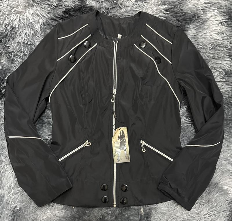 Нова легенька чорна курточка/піджак з білими смужками та гарними декоративними ґудзиками Розмір 46 М На підкладці, по бокам кармани, застібається на змійку попереду Якісна, на весну, літо ідеально підійде Всі бірки на фото Фото на собі не роблю