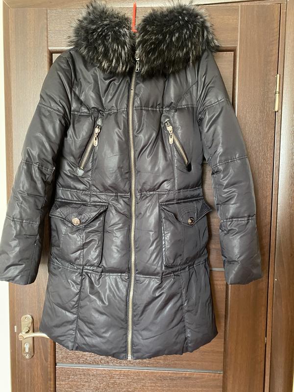 Жіночий пуховик чорного кольору ,на капюшоні натуральне хутро єнота